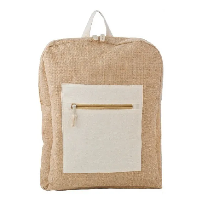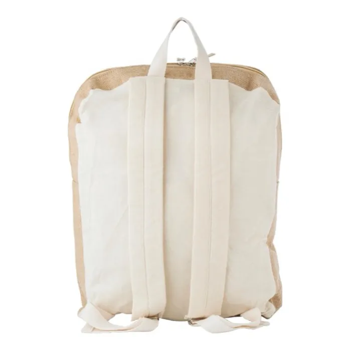 Zaino in juta con dettagli in cotone. Ha uno scomparto principale con cerniera e una tasca frontale in cotone. Spallacci regolabili.