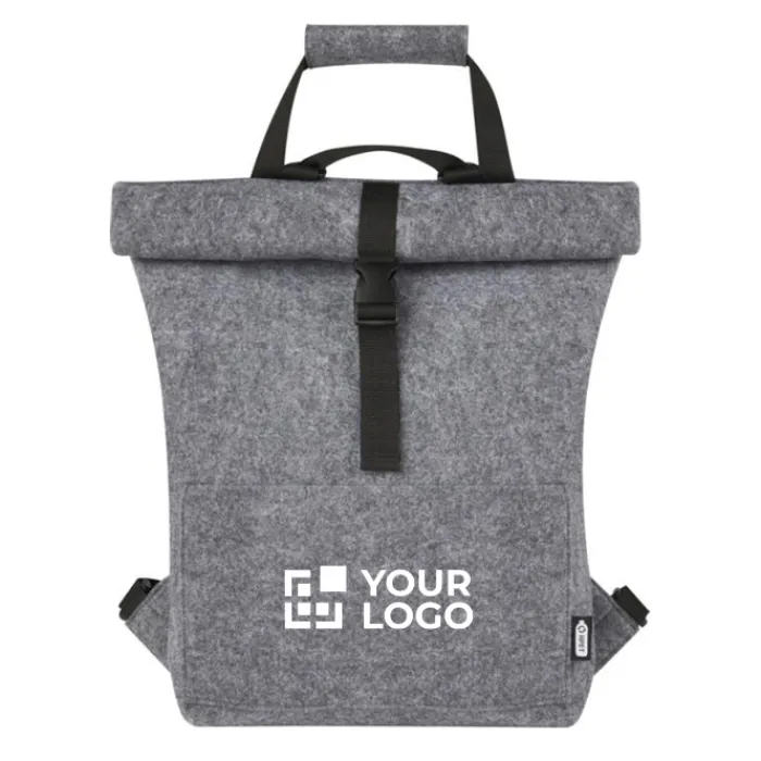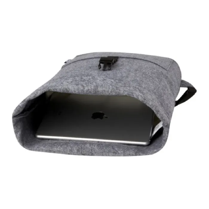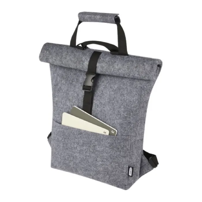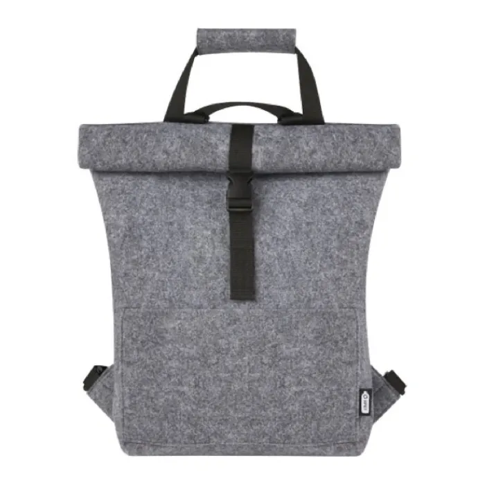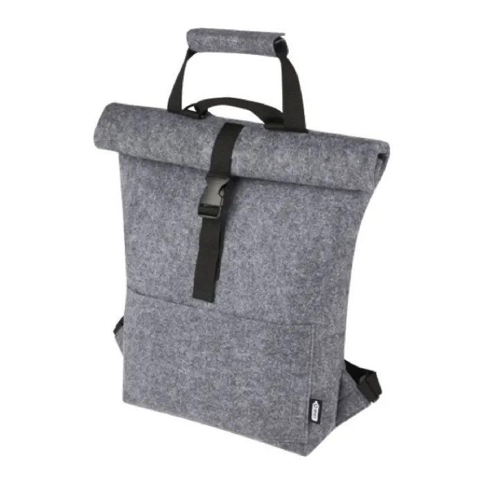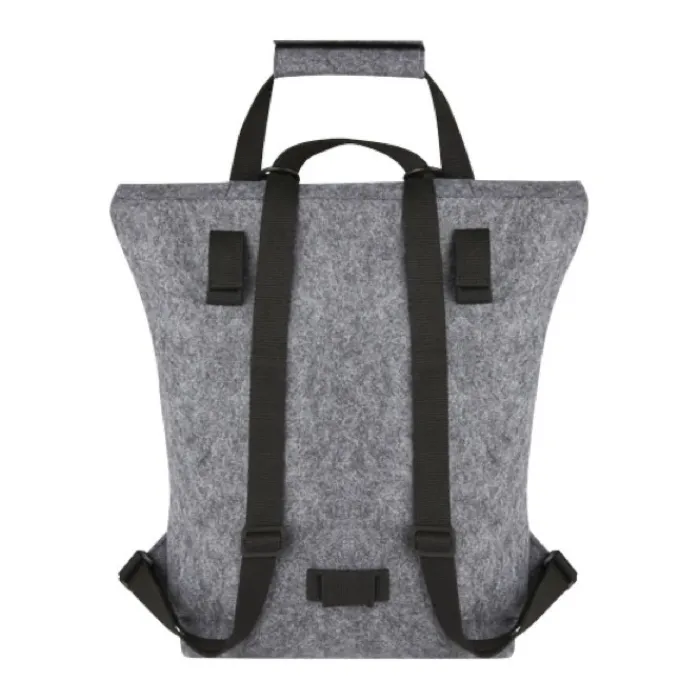 Zaino multifunzionale e alla moda, con chiusura arrotolabile con fibbia, realizzato in feltro riciclato di alta qualità, morbido e resistente certificato GRS. Dispone di un ampio scomparto principale, tasca anteriore, spallacci regolabili e 3 cinghie con ganci per fissarlo alla parte posteriore della bicicletta. Gli spallacci possono essere facilmente trasformati in una lunga tracolla o raccolti in modo che non si impiglino nella ruota della bicicletta. Capacità 13l.