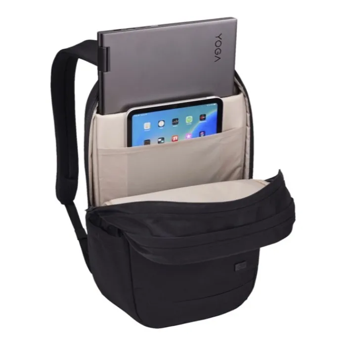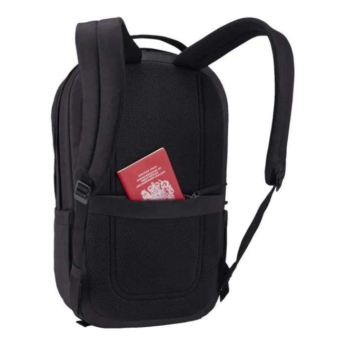 Zaino per portatile da 15,6″ Case Logic Invigo presenta un design semplice e raffinato, realizzato con materiali riciclati e dotato di due scomparti principali e di funzionalità organizzative accurate. È realizzato con un esterno in poliestere 600D riciclato al 100% e una fodera in poliestere 150D. Lo scomparto imbottito può contenere un portatile da 15,6” e la custodia per il tablet può contenere un tablet da 12,9”. All’interno dello zaino sono presenti tasche a bustina per riporre piccoli accessori e una tasca in rete con cerniera che offre un ulteriore spazio sicuro per contenere piccoli oggetti come le chiavi. All’esterno dello zaino invece si trova una tasca di sicurezza nascosta nel pannello posteriore che consente di tenere nascosti, ma a portata di mano, oggetti importanti come il passaporto o il portafoglio. La tasca anteriore consente di riporre rapidamente gli oggetti quando si è in giro, mentre le 2 tasche laterali sono adatte per contenere borracce o un ombrello. Lo zaino è inoltre dotato di un cinturino a passante che permette di agganciarlo al bagaglio a mano per viaggiare in modo più agevole.