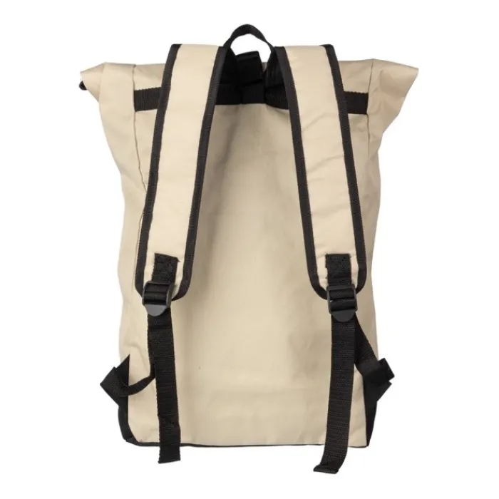 Zaino roll-top in rPET 600D, con ampio scomparto con cerniera e chiusura con fibbia in plastica. Tasca frontale con zip verticale. Spallacci regolabili.