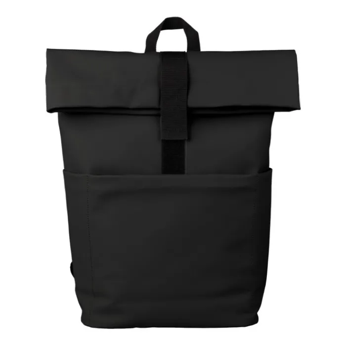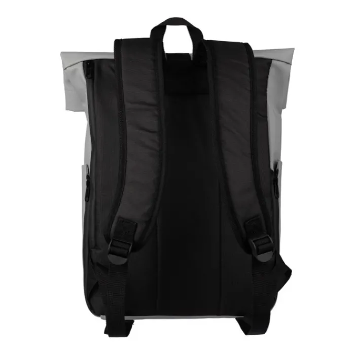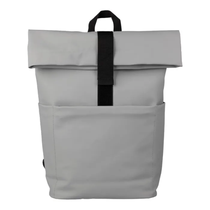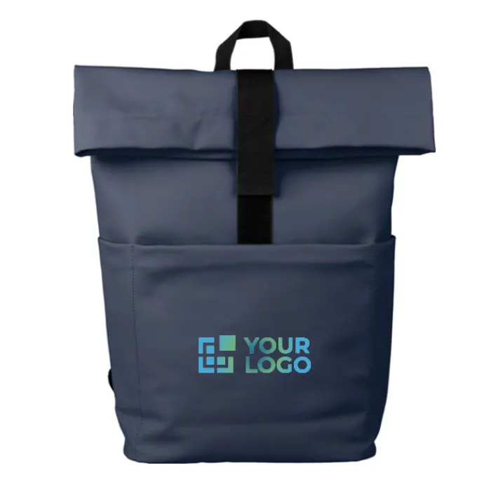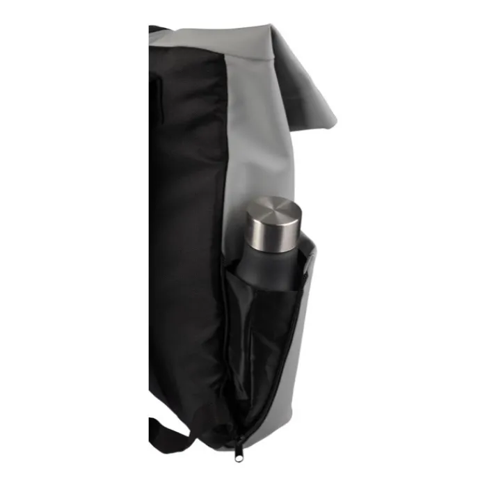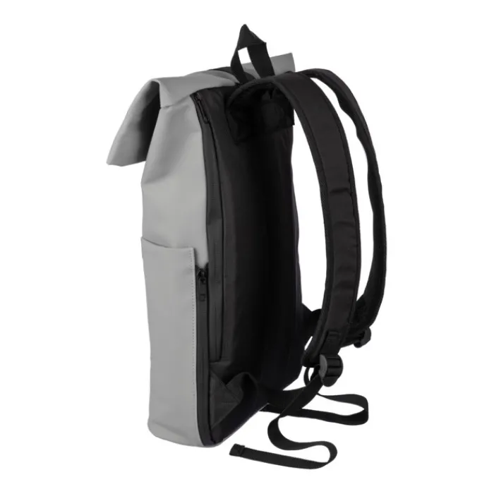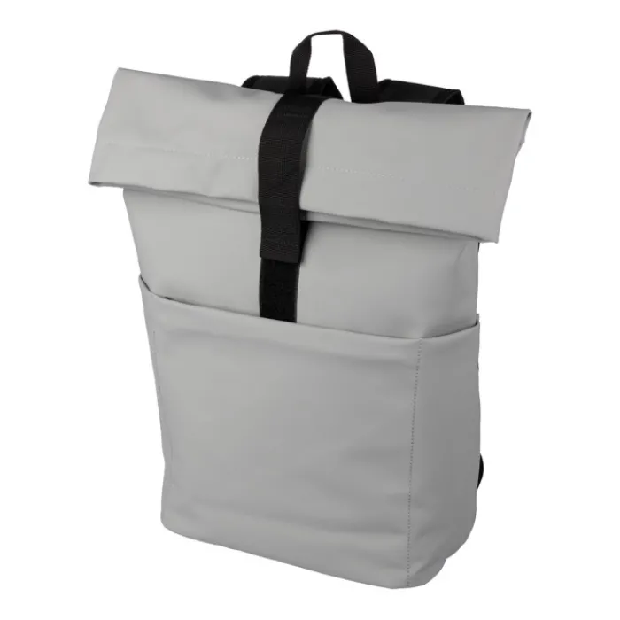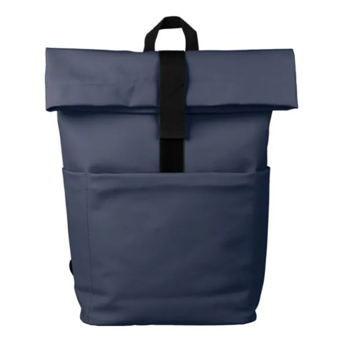Zaino rolltop in pelle PU con fodera in PU 210D e schienale in schiuma PE da 5 mm. Include una tasca per il pc portatile da 15 pollici e una tasca sul lato anteriore con chiusura lampo. Spallacci regolabili.