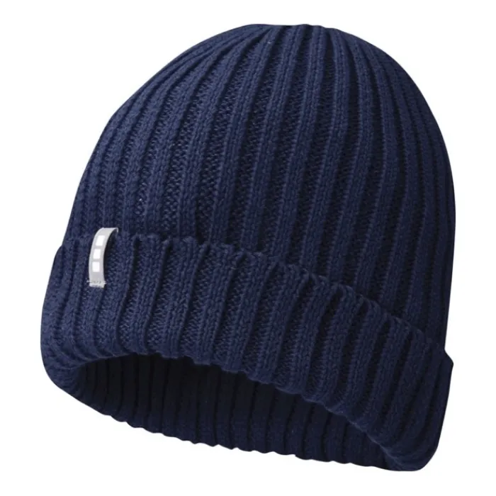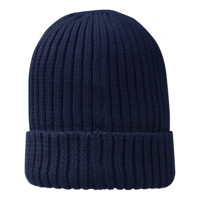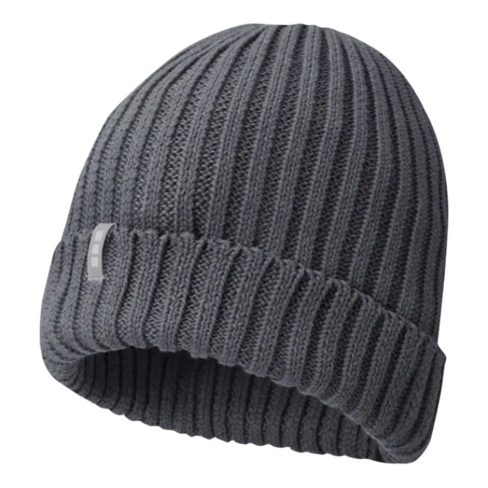 Berretto promozionale ecosostenibile a strato singolo con bordo dotato di doppio risvolto. Costa 2 x 2 100% cotone organico, finezza 7. Presenta etichetta del marchio Elevate™.